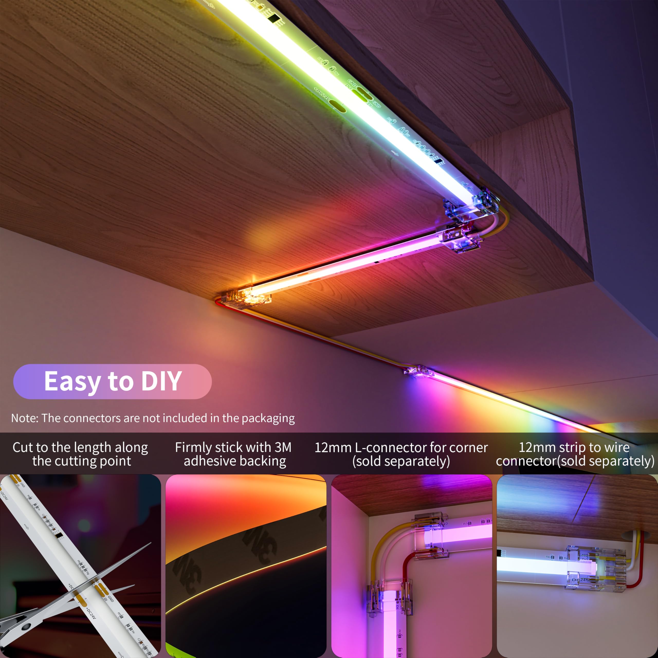 · FLEXIBLE,EASY TO DIY:PAUTIX RGB Smart IC addressable COB LED strip light designed in 12mm width & 3 electrical lines is very flexible. The strip is cuttable and connectable. You can cut or connect the strip every along the cutting point.Connectors for this strip are not available now, but you can solder by yourself(Search for “B0C5RHNRLV” to find a compatible 12mm connector kit)