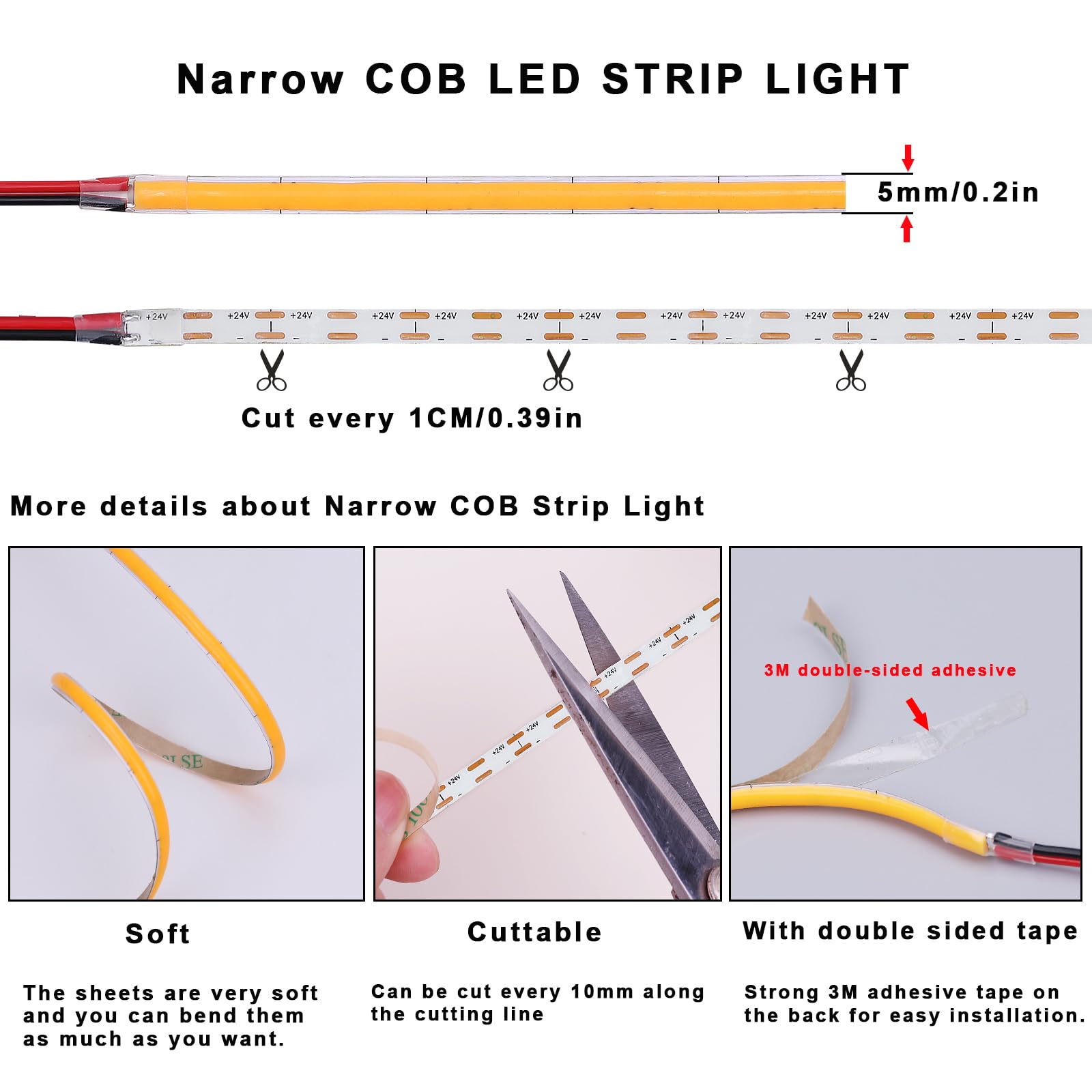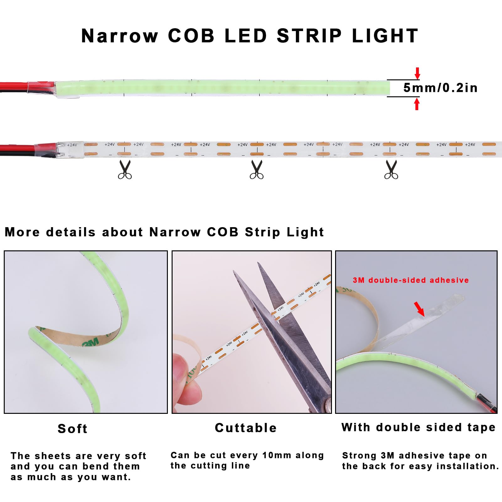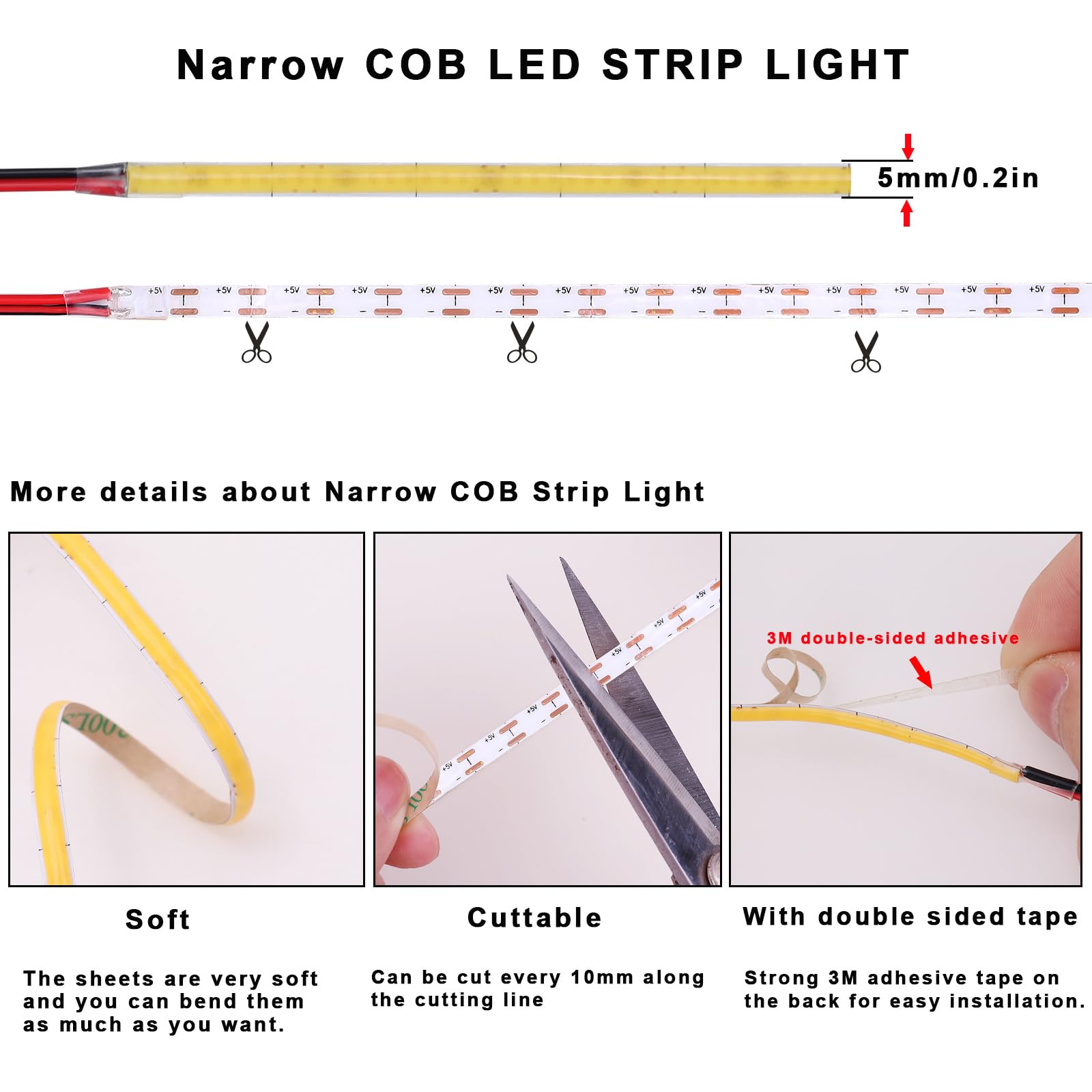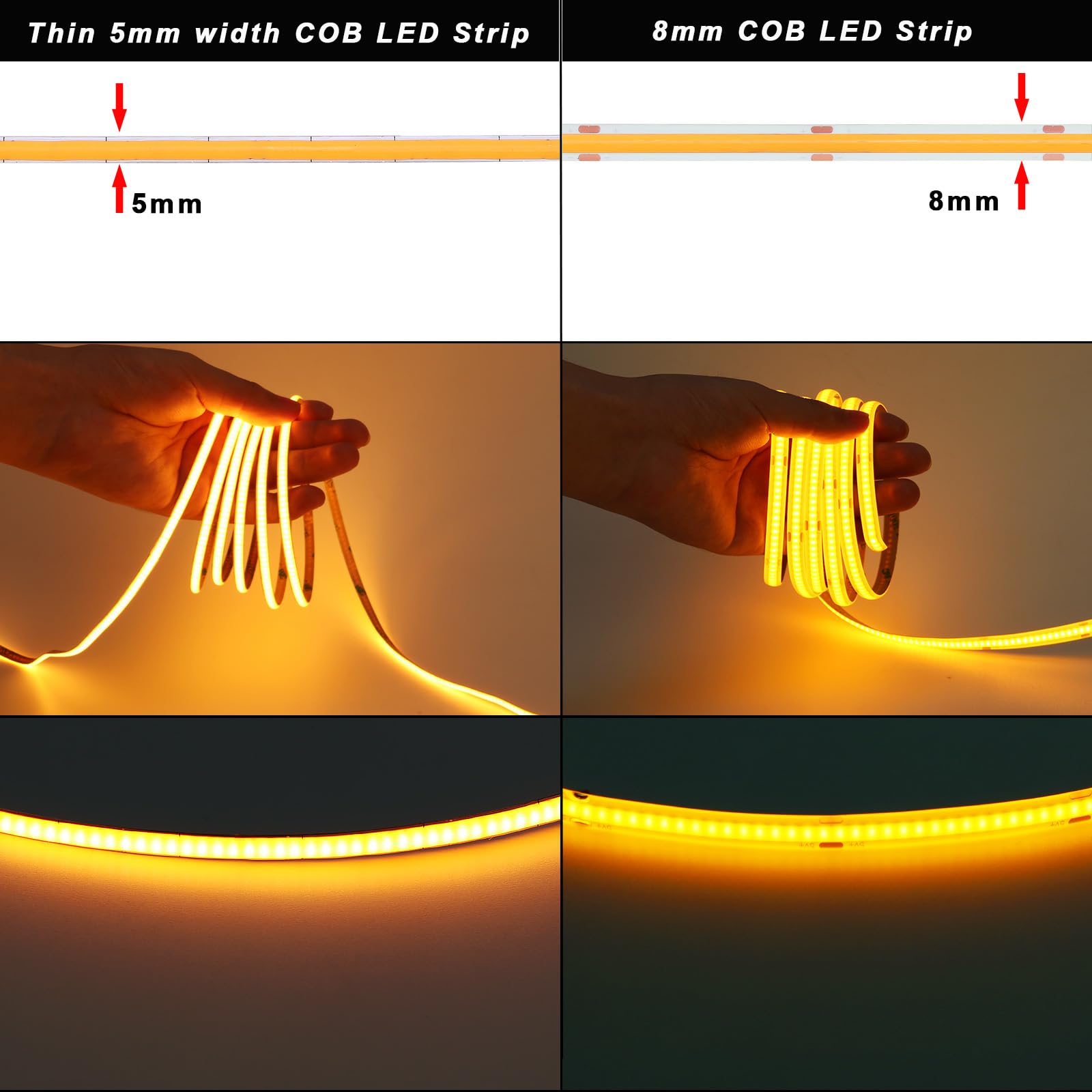 · 【Narrow PCB 5mm Width】The width of this COB light strip is only 5mm, while the width of ordinary COB light strip is 8mm.Compared with the general 8mm COB strip,the narrower 5mm allows you to install more easily,suitable for narrow spaces.