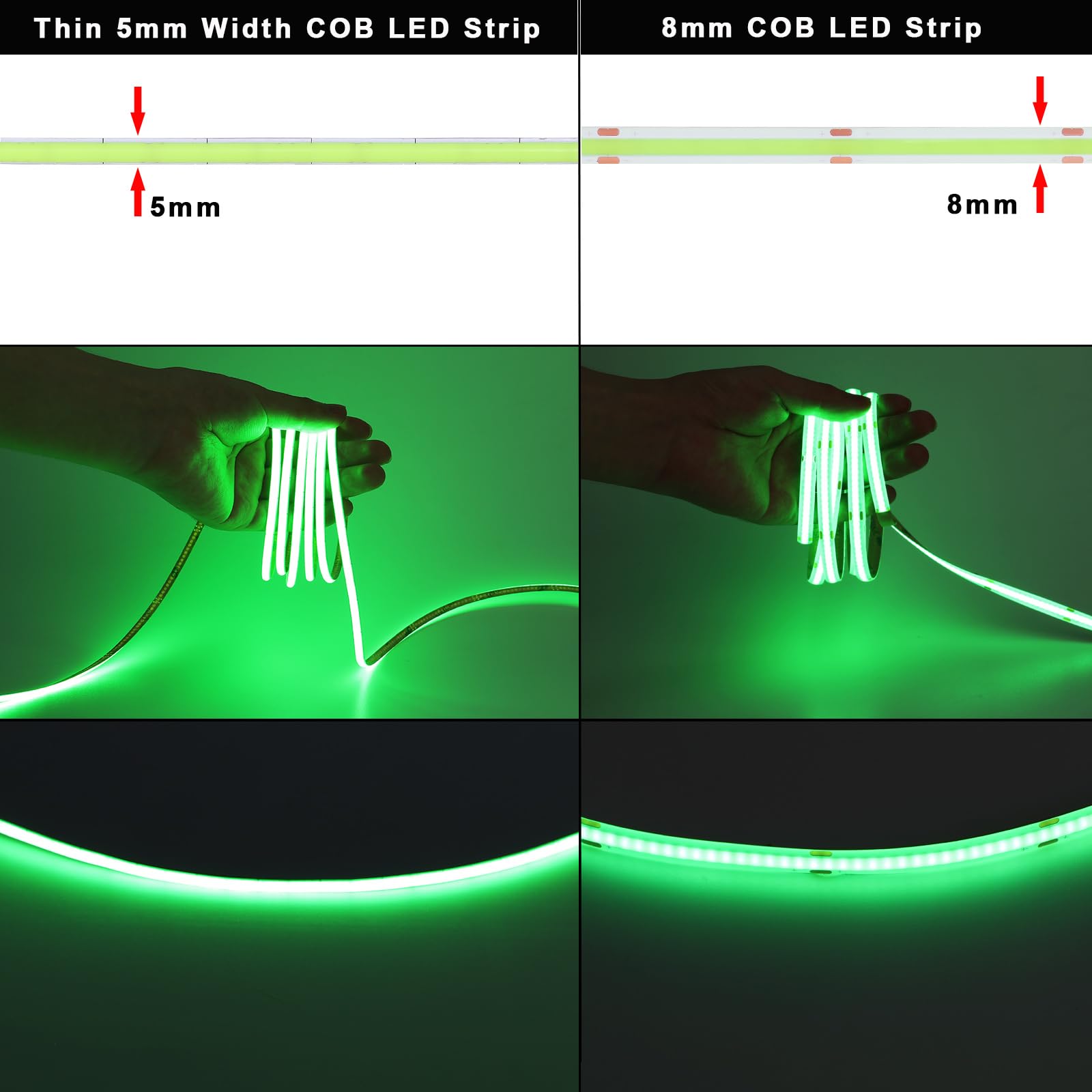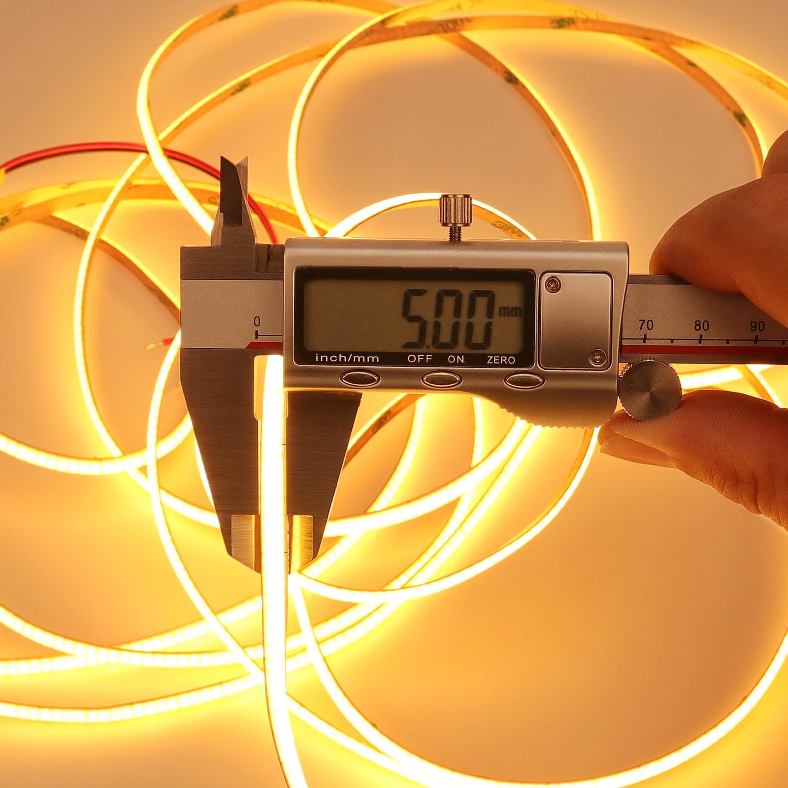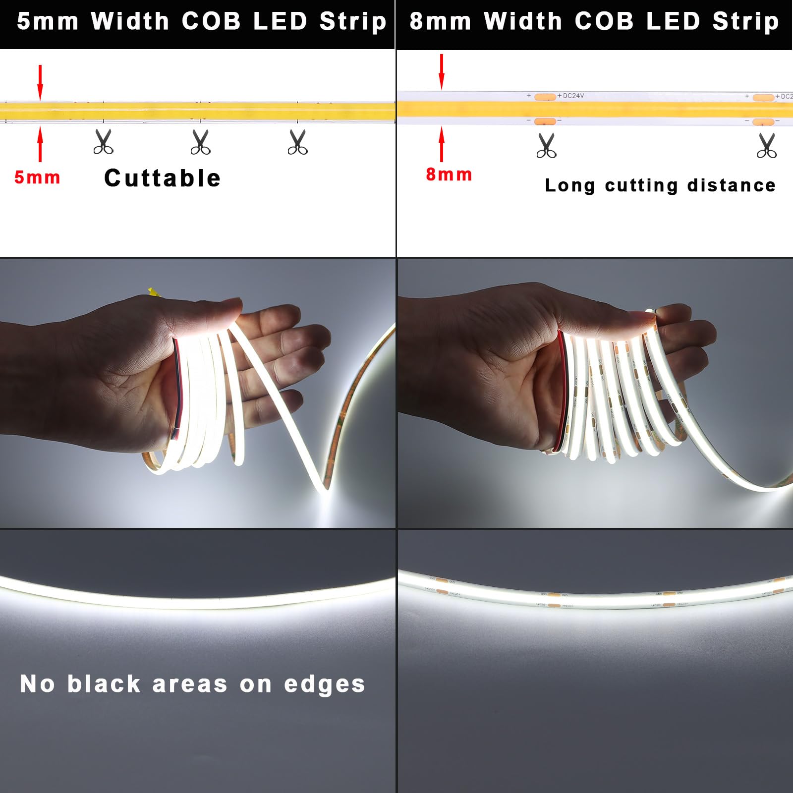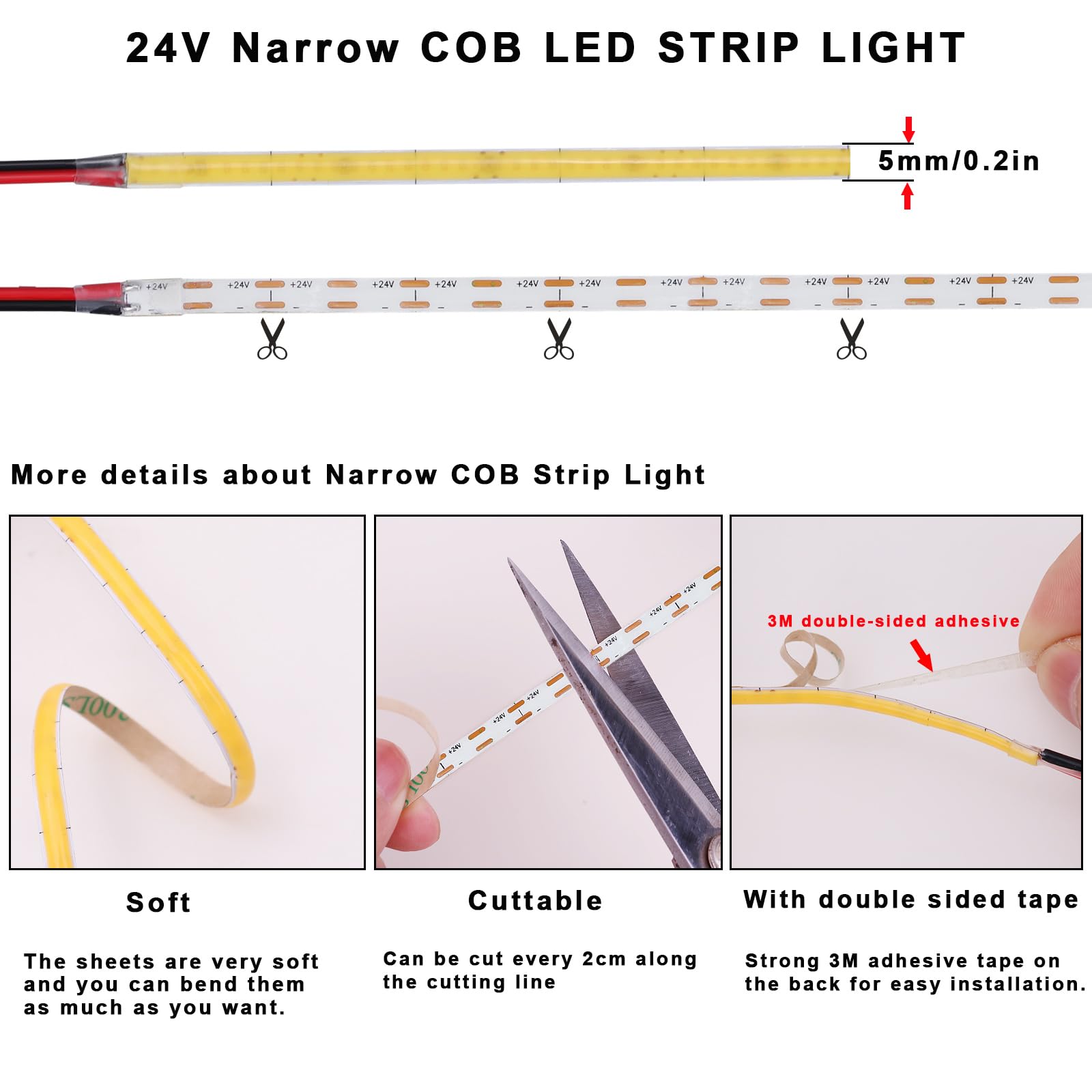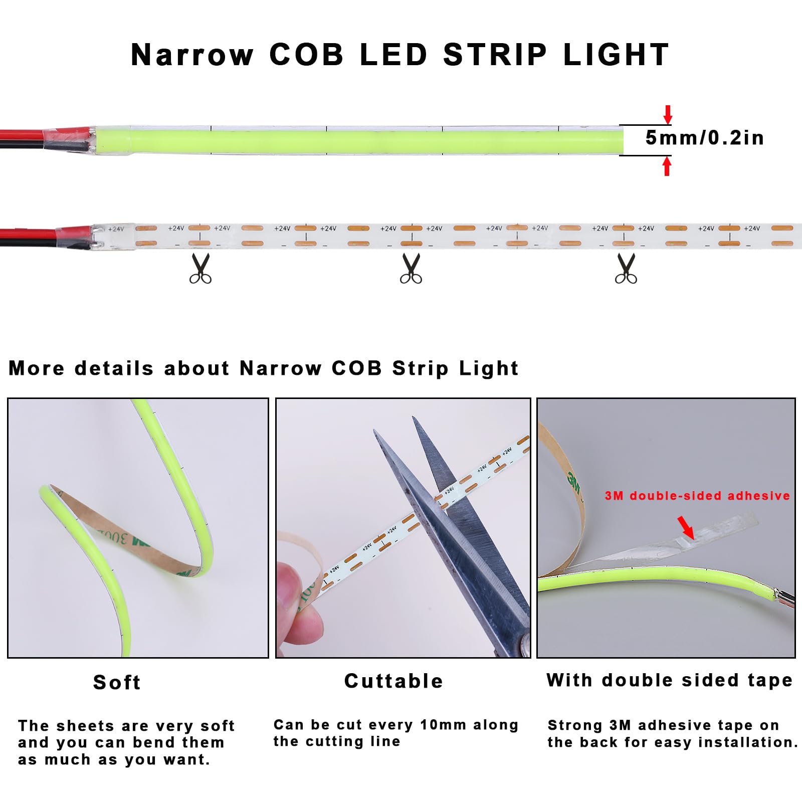 · 【Narrow PCB 5mm Width】The width of this COB light strip is only 5mm, while the width of ordinary COB light strip is 8mm.Compared with the general 8mm COB strip,the narrower 5mm allows you to install more easily,suitable for narrow spaces.